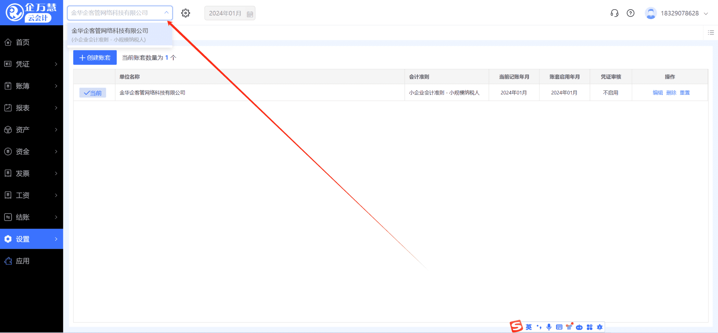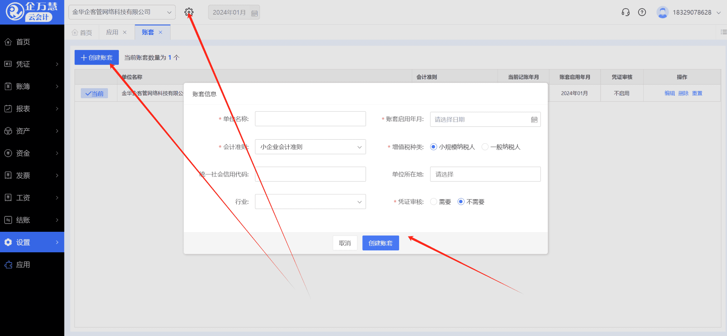①登录企万慧云财务软件后,点击主菜单的“设置”中“账套”;